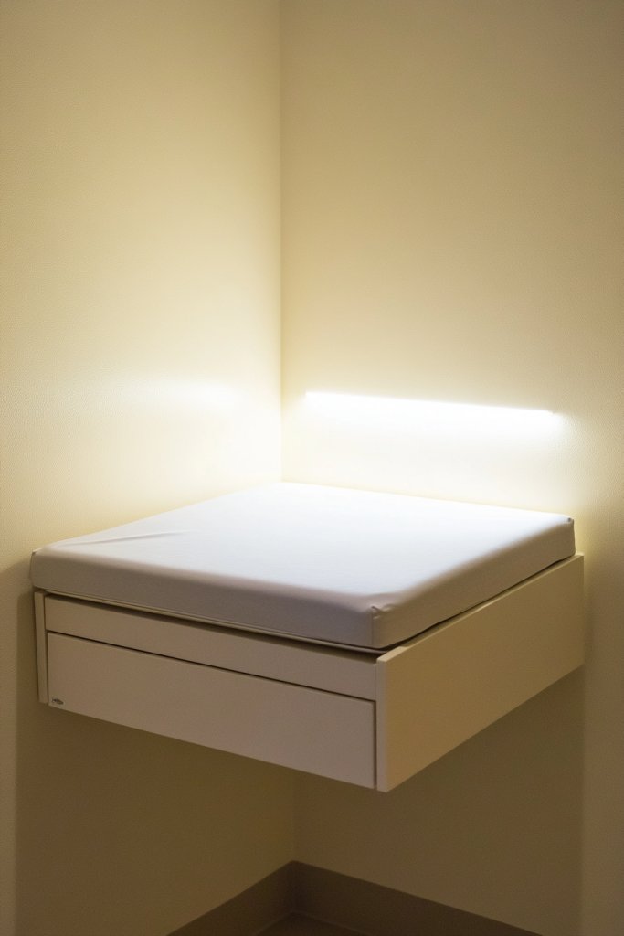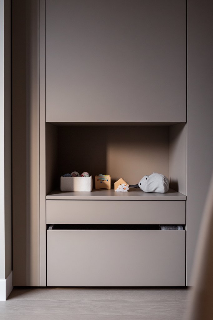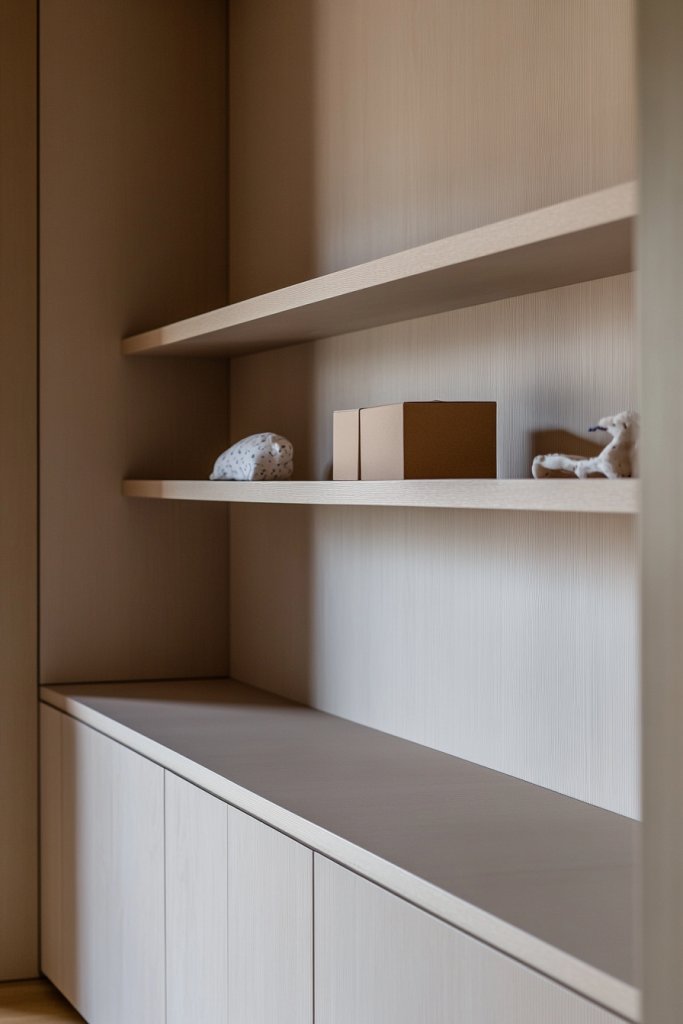 Picture a wall with recessed shelves flush with the wall surface, painted in the same neutral tone. The shelves hold neatly folded blankets, baskets with toys, or essential supplies—everything within arm’s reach. The smooth, uninterrupted surface creates a sense of order and calm. When lit with soft, indirect lighting, the shelves cast gentle shadows, adding depth and elegance.