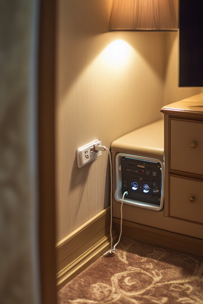 Visualize neatly routed cords concealed behind furniture or within wall channels, emerging only where necessary. Use cable covers that match the wall color, creating a seamless appearance. Cords are hidden from view as they run along baseboards or inside furniture cavities. This setup keeps the space looking organized and uncluttered, even with multiple devices in use.