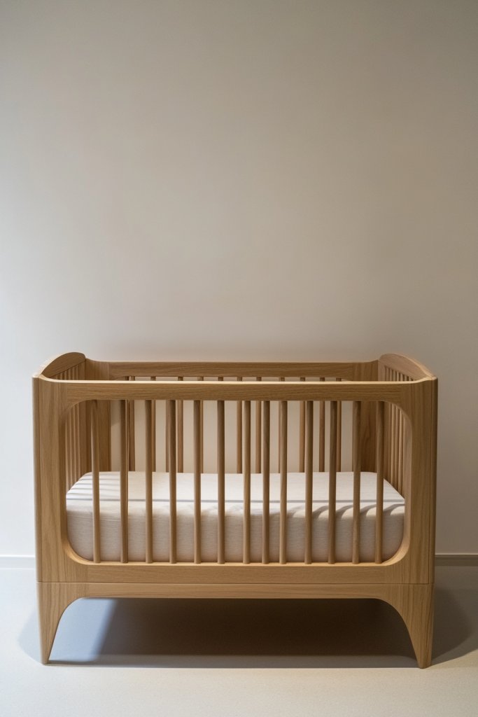 Imagine a solid wood crib with smooth, unadorned surfaces painted in matte white, natural oak, or muted gray. Its simple silhouette features straight edges and subtle curves, exuding a modern yet cozy vibe. The slatted sides allow visibility and airflow, while the sturdy frame provides peace of mind. Surround it with soft textiles and neutral-toned bedding for a harmonious, uncluttered look.