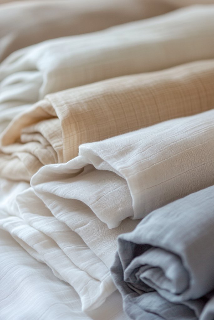 Visualize soft, solid-colored swaddles in muted tones like blush, cream, or light gray. They drape gently over a crib or are folded neatly on a shelf, adding subtle texture. The fabrics have a matte finish, with gentle textures like cotton, muslin, or linen, which catch the light softly. Layering these textiles creates a cozy, inviting space that’s tactile and calming.