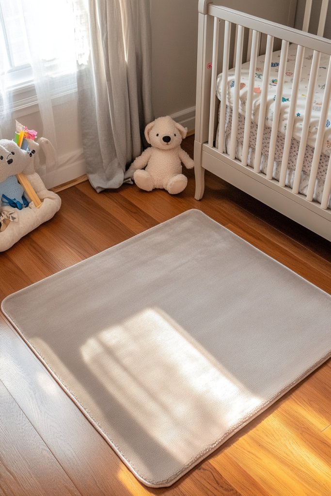 Imagine a plush, neutral-toned rug in shades of warm beige, soft gray, or muted taupe laid out under the crib. Its low pile offers a gentle surface that’s safe for tiny hands and knees. The subtle texture creates visual depth without cluttering the space. The rug anchors the room, tying together furniture and textiles with a cohesive, minimalist vibe.