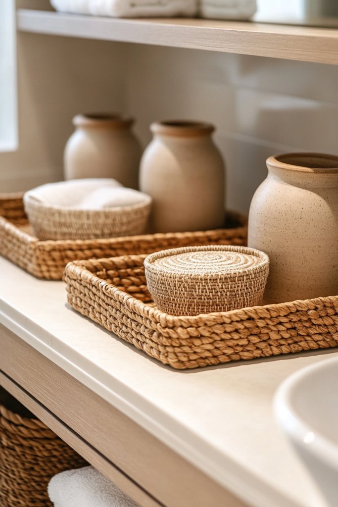 Imagine woven baskets, wooden shelves, or neutral-toned cabinetry that blend seamlessly into your decor. The textures add warmth and authenticity, contrasting beautifully with smooth countertops and tiles. When organized neatly, these storage solutions create a streamlined look that feels both functional and inviting. It’s like having a secret haven of order amidst the calm.
