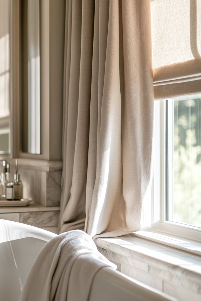 Add tactile accents like a textured curtain tie or a decorative pelmet in a matching neutral hue. Incorporate a soft, matching bath mat or textured towels nearby to enhance tactile consistency. Use subtle decorative trims or piping for a polished finish. Keep accessories simple but cohesive for a streamlined aesthetic.