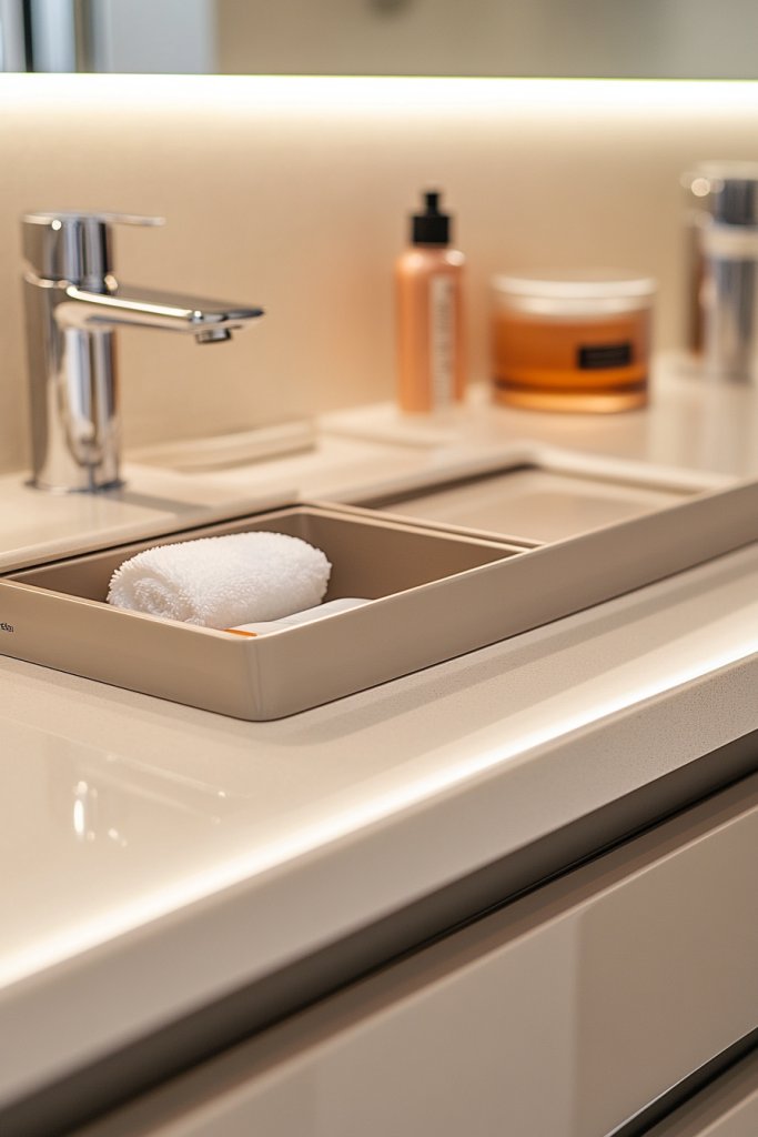 Picture a sleek countertop with only a few essential items—perhaps a subtle soap dispenser and a textured towel. Behind the scenes, cleverly designed drawers or cabinets hide your everyday clutter, keeping the surface clear. When you open a cabinet, you find neatly organized containers or trays that make everything easy to access. The overall look is minimalist and calming, free of visual noise.