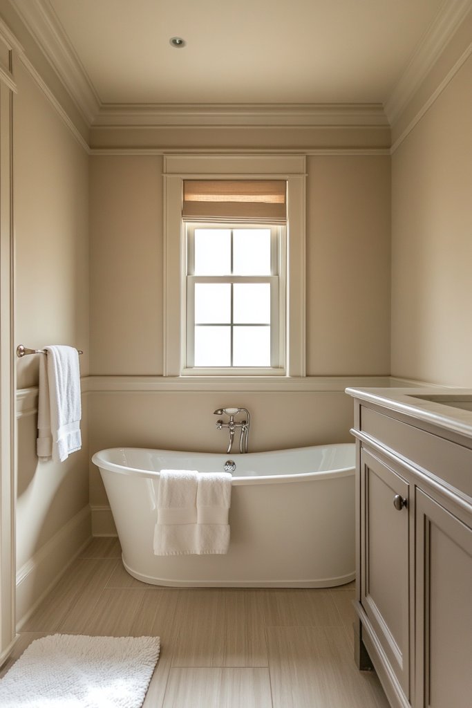Opt for matte or eggshell finishes to reduce glare and enhance the soft feel. Seasonal updates could include swapping out textiles or towels in slightly different shades within your neutral palette. Use accent walls sparingly or keep the entire space in a consistent tone for a seamless look. Light-colored ceilings help bounce light and keep the room feeling airy.