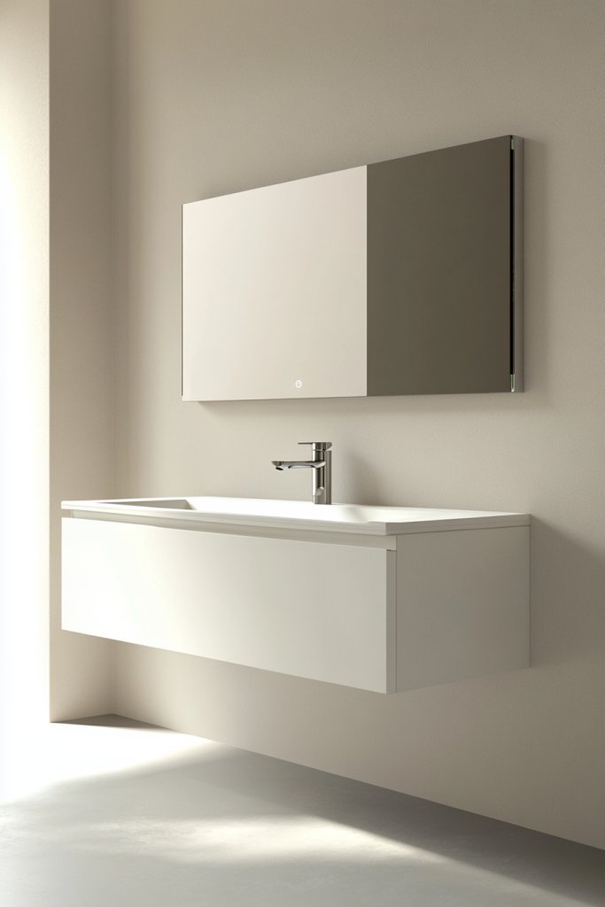 Picture a floating vanity in a neutral tone, with a smooth, flat surface and no visible hardware. It appears to hover effortlessly above the floor, opening up the room and making it easier to clean underneath. The clean lines and minimalist silhouette evoke calm and order. Pair it with a simple, frameless mirror and subtle lighting for a contemporary, airy vibe. It’s the kind of piece that feels both practical and stylish.