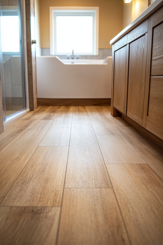 Imagine soft, light oak planks or textured vinyl that mimics natural wood, laid seamlessly across your bathroom floor. The warm tones contrast beautifully with neutral walls and countertops, creating a balanced, harmonious look. When you walk in, your senses are greeted with a gentle, natural feel—an inviting warmth that makes the space feel more like a sanctuary. The subtle grain patterns and matte finishes add depth without overwhelming simplicity.