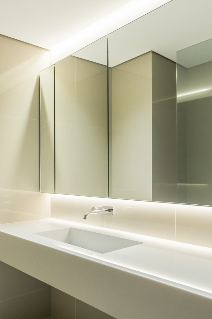 Add a touch of warmth with textured or etched glass designs if you prefer a bit of visual interest. Incorporate subtle lighting around the edges for a soft halo effect. Keep the area around the mirror clutter-free, perhaps with a small shelf or hidden storage behind the mirror itself. Select minimal accessories to let the mirror remain the focal point.