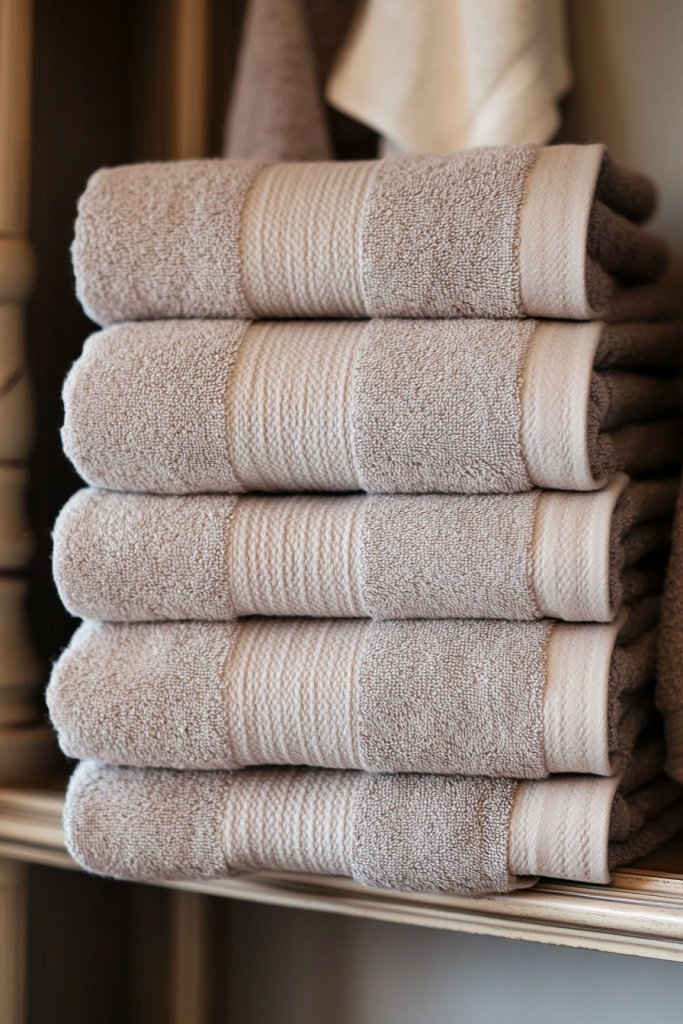 Mix and match towels in different sizes and textures for visual interest—think waffle weaves or ribbed patterns. Seasonal swaps could involve heavier, plush towels for winter or lightweight linen for summer. Incorporate textured or woven storage baskets nearby for a cohesive look. Keep the color palette consistent for a serene, harmonious vibe.