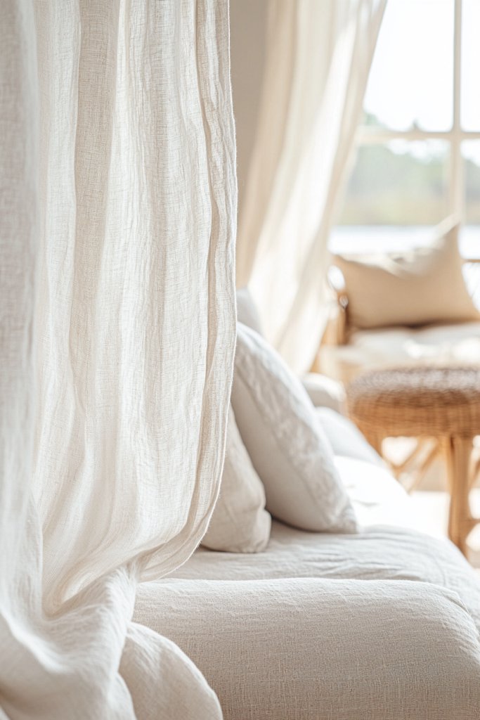 Choose from sheer, lightweight linens for a delicate look, or go for thicker, textured fabrics for more privacy. For a beachy vibe, add tiebacks made of jute or rope for a nautical touch. Seasonal changes may inspire swapping out lighter fabrics for warmer, cozy options during winter. Layering with sheer panels or adding subtle trim can also personalize the look further.