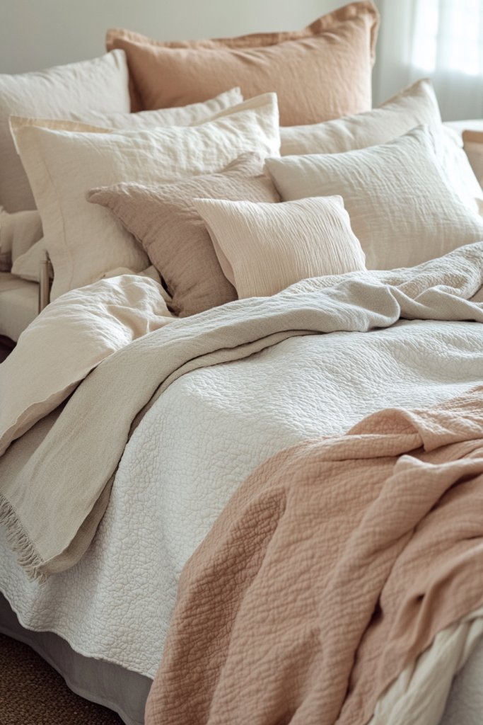 Start with a neutral base of crisp sheets and a comforter or duvet in a soft, sandy hue. Layer with textured throws and multiple pillows—think different fabrics and sizes for an eclectic yet cohesive look. Use decorative shams or pillow covers with subtle patterns or embroidery. Keep the overall palette soft and cohesive for serenity. Wash and fluff regularly to keep textures inviting.