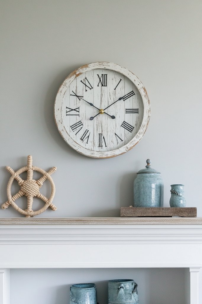 Select a clock with a weathered, vintage look that complements your space. Mount it securely at eye level, ensuring it’s centered and straight. Use wall anchors if needed for heavier pieces. Pair with other subtle coastal accents like textured throws or woven baskets. Regularly dust and maintain the finish for longevity. Consider changing the clocks seasonally for a fresh look.