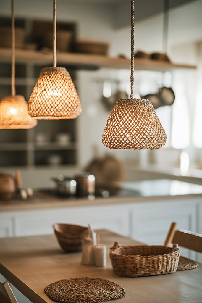 Picture a cluster of pendant lights hanging at different heights over a kitchen island or dining table. Their woven textures cast intricate shadows, creating a cozy glow. The natural fibers complement neutral walls and soft textiles, enhancing the relaxed coastal vibe. The organic shapes add visual interest and tie the decor together seamlessly.