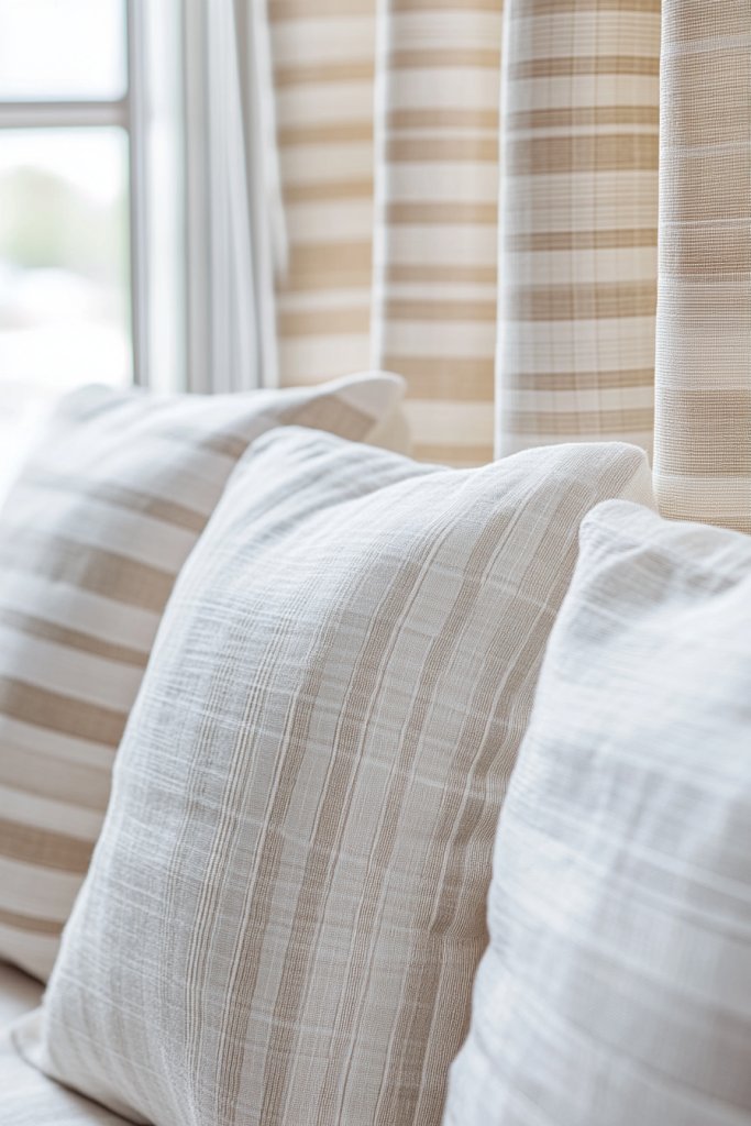 Choose textiles with subtle stripe patterns in natural fibers like linen, cotton, or burlap. Coordinate with your overall color scheme—stick to soft neutrals for a calm, coastal feel. Use curtain rods or decorative pins that match your decor style. Wash and care for textiles according to their fabric type to maintain their appearance. Layer different textiles to achieve a cozy, layered look.