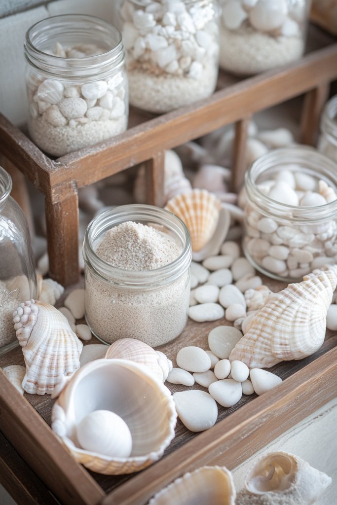 Picture a collection of small jars filled with sand and tiny shells, arranged on a shelf or mantel. The neutral tones of the shells and pebbles add visual interest without cluttering. Arranged thoughtfully, these pieces evoke the tranquility of a beach walk or shoreline. They serve as quiet, tactile reminders of the coast’s natural beauty.