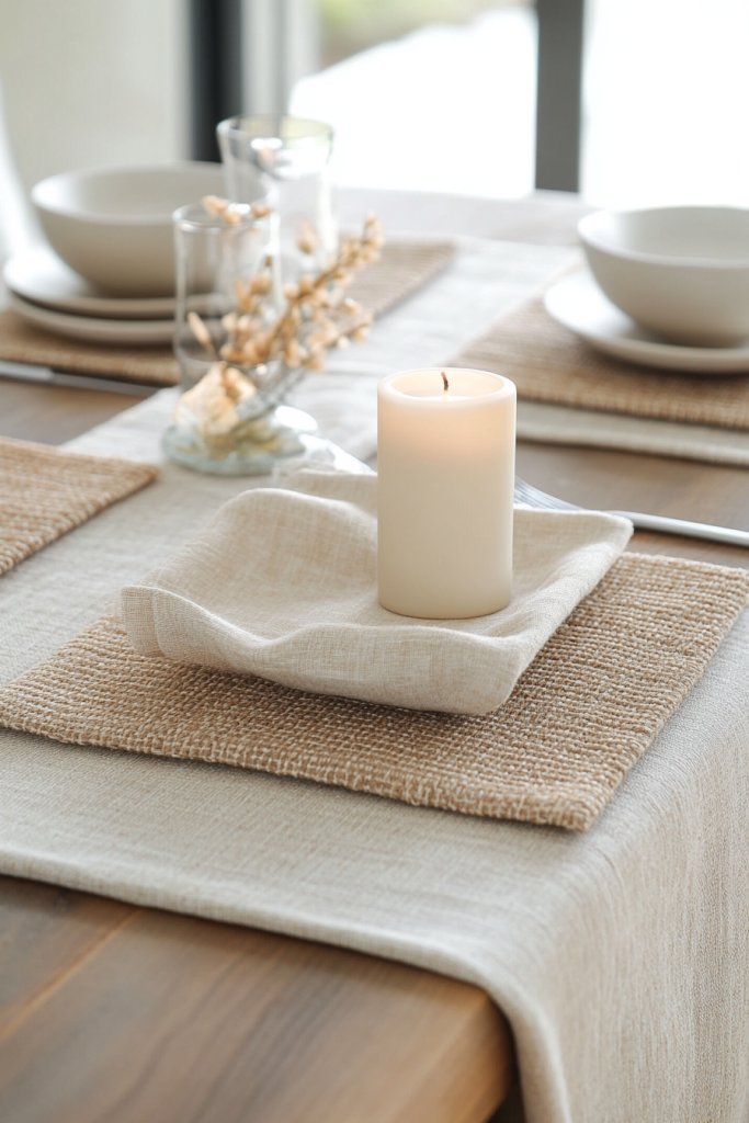 Imagine a linen or jute runner in sandy beige running the length of your table, paired with matching placemats in woven textures. The subtle patterns and tactile surfaces invite touch and create a cozy, inviting atmosphere. Soft lighting reflects off the textures, highlighting the natural, understated beauty. It’s a simple detail that instantly elevates gatherings.