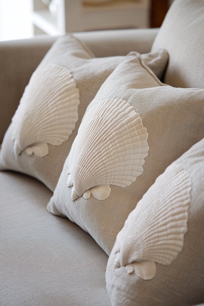 Picture soft, neutral fabrics like linen or cotton embroidered with delicate seashell or coral motifs. These pillows sit casually on a neutral sofa or bed, inviting touch and adding visual interest. The subtle embroidery catches the eye without overpowering the room’s calm palette. Their textured surface adds depth, making the space feel layered and inviting.