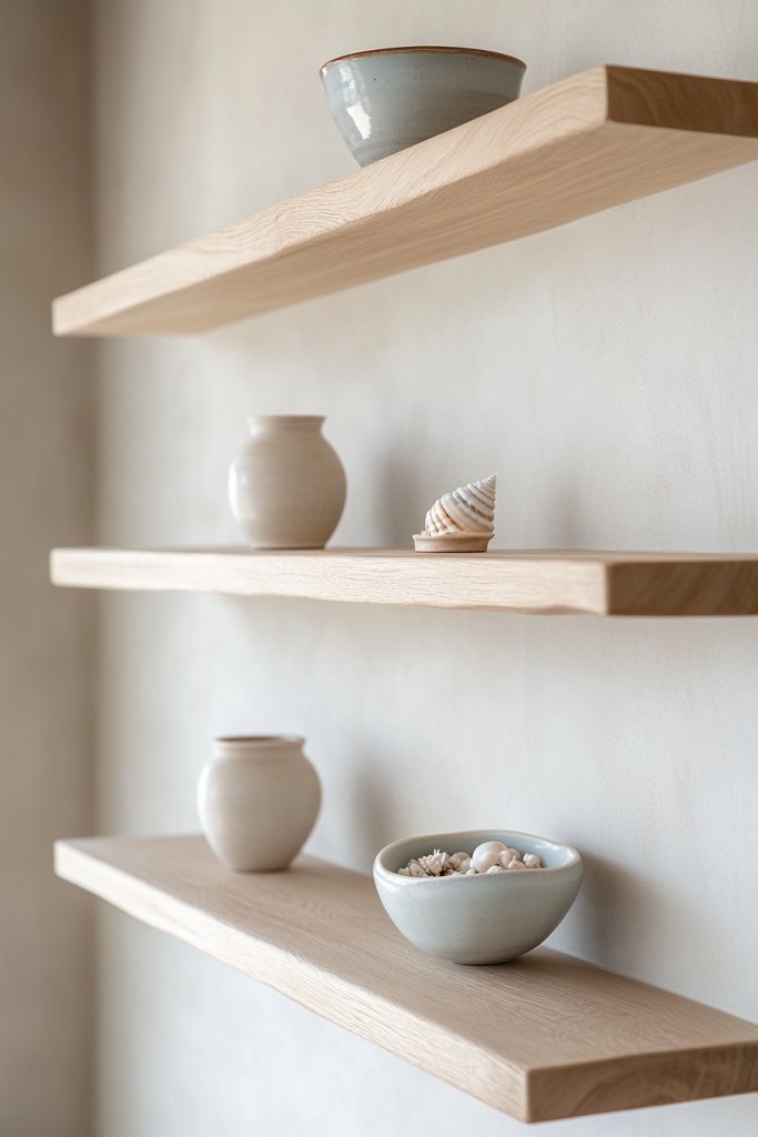 Imagine floating light wood shelves mounted on a neutral-colored wall, with neatly arranged baskets, ceramics, or books. The open design invites you to curate your decor, mixing functional items with decorative pieces. Light wood tones add a natural element that balances the soft neutrals and enhances the coastal aesthetic. The open space creates a sense of flow and openness.