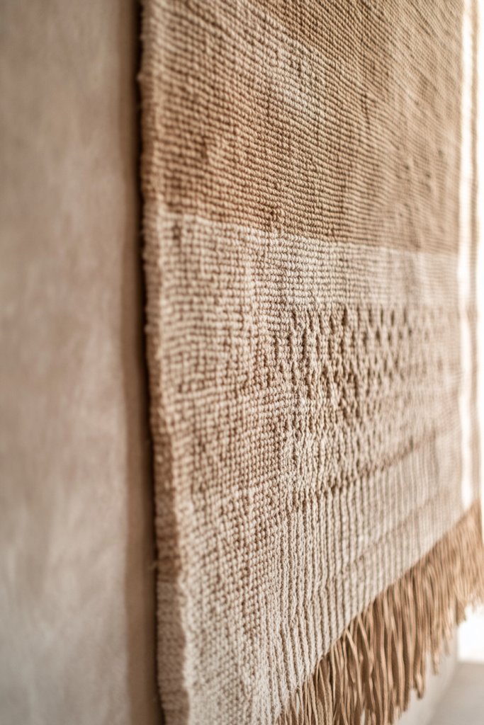 Picture a large, textured woven piece in sandy beige or soft taupe, hanging above a sofa or bed. The intricate weave pattern adds depth and dimension, contrasting beautifully with smooth walls. The natural fibers catch the light subtly, creating a cozy, inviting atmosphere. These hangings serve as artful focal points that enhance the room’s organic vibe.