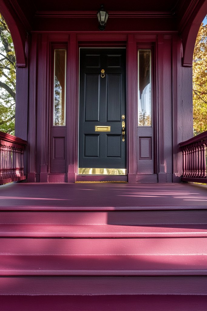 Burgundy’s rich tone radiates warmth and sophistication, instantly elevating your home’s curb appeal. It’s a versatile color that pairs well with many styles—from traditional to modern. Once you see the luxurious transformation, you’ll be inspired to explore more refined palettes. Your porch will exude elegance and inviting warmth.