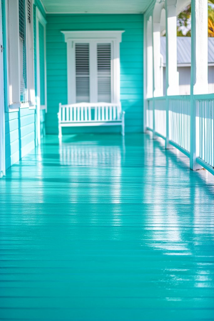 Picture a vibrant turquoise door or walls paired with white trim and colorful outdoor accents. The color reflects sunlight, creating a fresh, invigorating atmosphere. Add playful textiles like striped cushions or patterned rugs to enhance the lively feel. Nighttime lighting casts a cheerful glow, making your porch a joyful retreat.