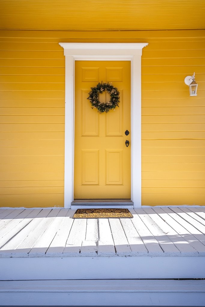 Imagine a bright mustard door accented with white or cream trim, complemented by cozy textiles and decorative details. Sunlight makes the color glow, casting a cheerful, uplifting atmosphere. Add textured mats or cushions in earthy tones to enhance the sunny vibe. Nighttime lighting creates a warm, inviting glow that beckons visitors.
