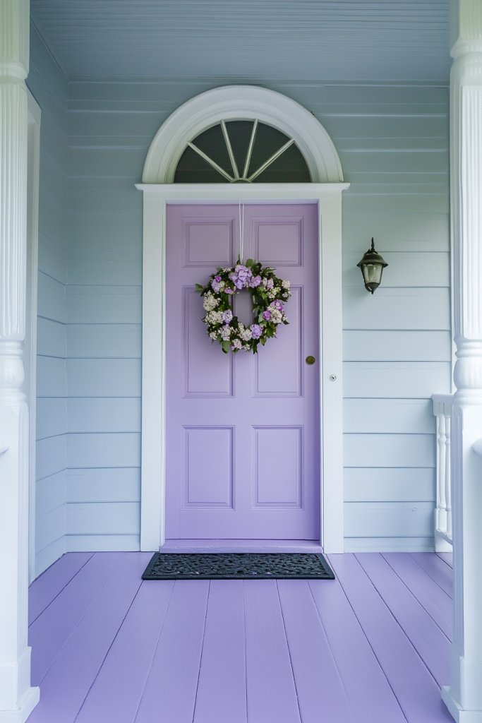 Imagine a lavender-painted porch accented with white trim and delicate textures. Soft sunlight enhances its gentle hue, creating an atmosphere of calm and refinement. Complement with textiles like linen cushions or woven throws in neutral tones. Subtle lighting at dusk adds to the peaceful ambiance, making your entry feel like a retreat.