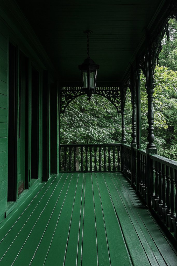 Picture a deep green porch accented with black or brass hardware, and textured textiles in warm neutrals. The lush hue absorbs light, creating a cozy yet impactful vibe. Add ambient lighting to highlight architectural details and deepen the color’s richness at night. Natural stone or weathered wood complements the intense, organic feel.
