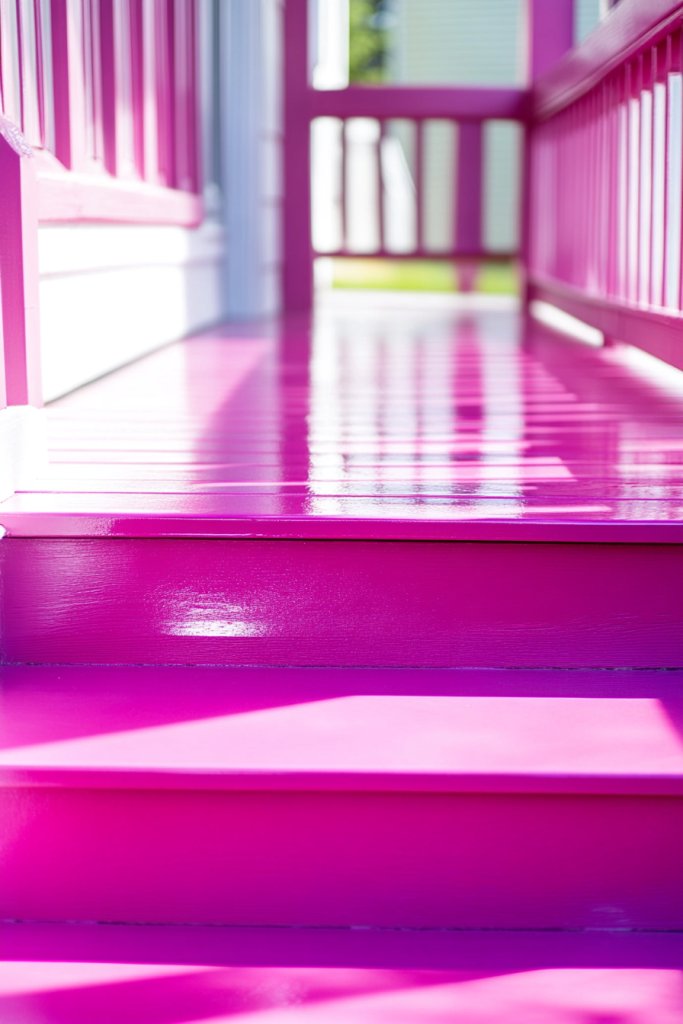 Picture a fuchsia door or walls paired with contrasting white or black fixtures and decor. Bright sunlight enhances its vibrancy, while playful textiles like patterned cushions or outdoor art amplify the cheerful vibe. Nighttime lighting creates a warm glow, making your porch a lively gathering spot. It’s like bringing a burst of joy to your curb.