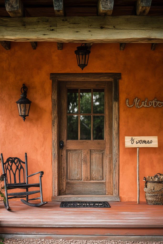 Visualize a terracotta-colored porch accented with wooden beams, vintage lanterns, and textured stone elements. The warm hue complements weathered wood furniture and brass fixtures, creating a cozy, timeless vibe. Soft ambient lighting at dusk enhances the warmth, making visitors feel instantly at home. This color pairs beautifully with natural materials, emphasizing comfort and authenticity.