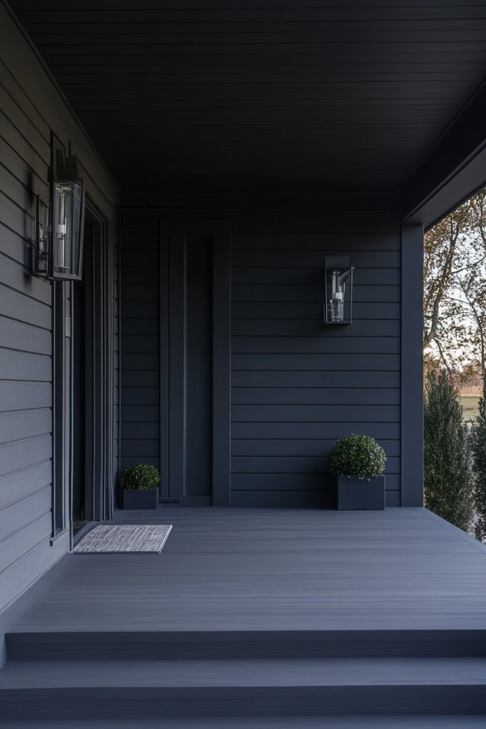 Visualize a dark gray porch with matte black fixtures and minimalistic decor. The deep hue absorbs light, creating a cozy yet refined environment. Accentuate it with metallic or natural wood details to add warmth and texture. Soft lighting at dusk highlights the rich, velvety finish, making your entry feel inviting yet sophisticated.