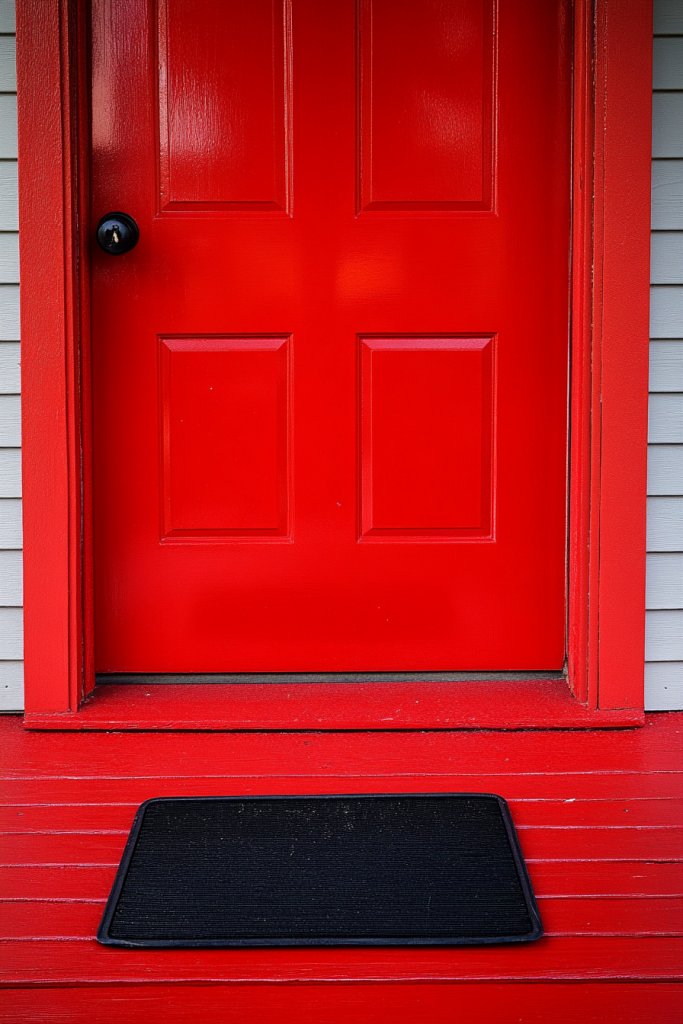 Visualize a fiery red door or porch walls contrasted with black or white trim. Bright sunlight makes the color pop, creating a lively, welcoming vibe. Add decorative elements like patterned cushions or playful outdoor art to amplify the cheerful energy. Soft lights at night cast a warm glow, making the space feel lively and inviting.