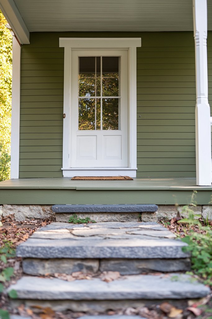 Picture a muted olive green on your porch, accented with textured wood and stone details. The color blends seamlessly with surrounding greenery, creating a harmonious environment. Soft lighting enhances its natural appeal, while woven textiles or textured mats add warmth. It’s like inviting the outdoors inside with a gentle, earthy palette.