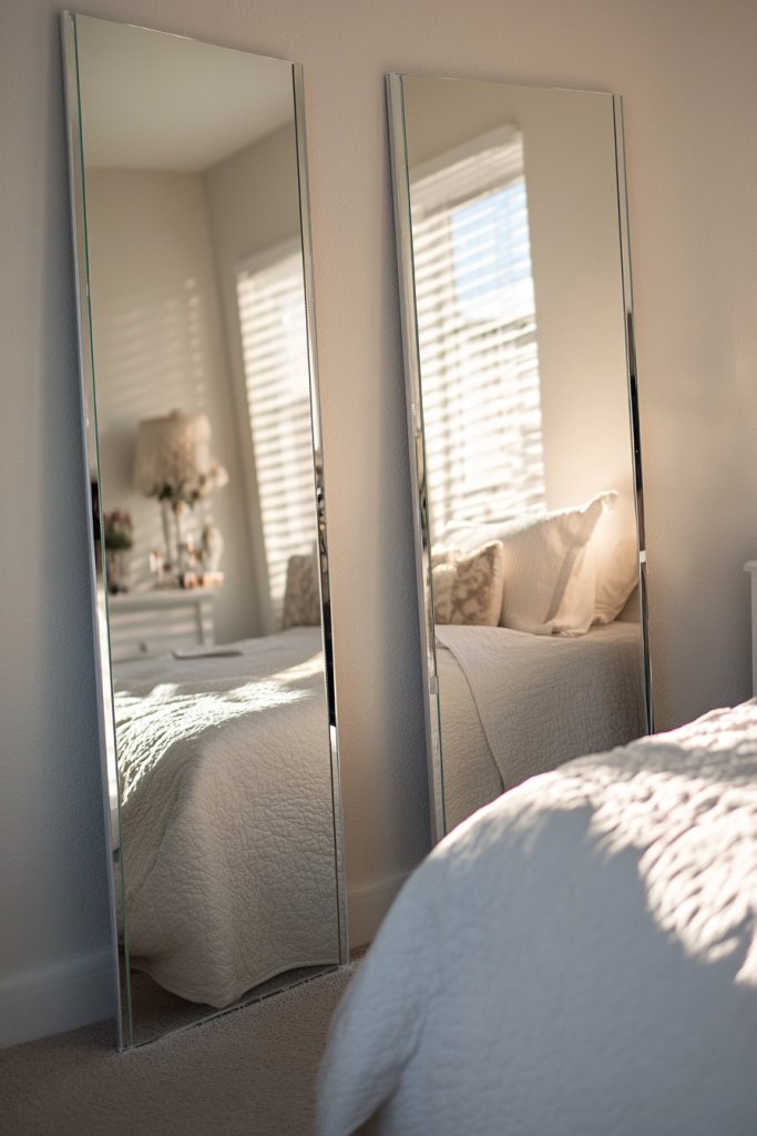 Frame the mirrors with decorative trims or add LED backlighting behind panels for a night-time glow. Use multiple small mirrors arranged in a pattern for visual interest. Incorporate reflective accessories or metallic accents nearby to amplify the light. Change the arrangement periodically for a fresh look.