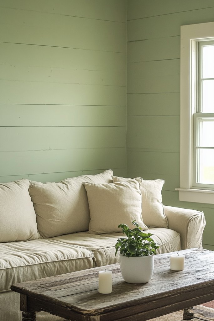 This gentle sage works well with both warm and cool decor palettes. Pair it with beige or taupe furniture for a cozy vibe or contrast with crisp whites and navy accents for a more modern look. You can also adapt it seasonally by layering textiles—think warm throws in winter or lightweight linen cushions in summer. Small touches like textured cushions or soft curtains enhance the calming effect.