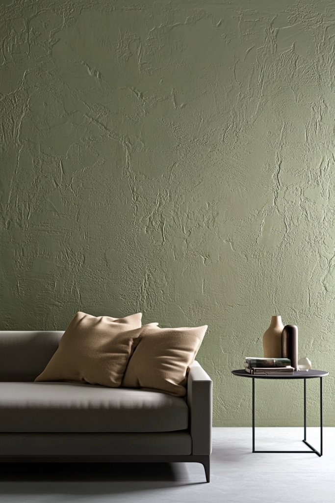 Picture a wall with a faux plaster finish in a muted sage, adding a sense of history and craftsmanship. The texture catches light at different angles, creating shadows that shift throughout the day. Complement it with simple furniture and minimal decor, allowing the wall’s texture to shine. The overall vibe is warm and inviting, with a handcrafted feel.