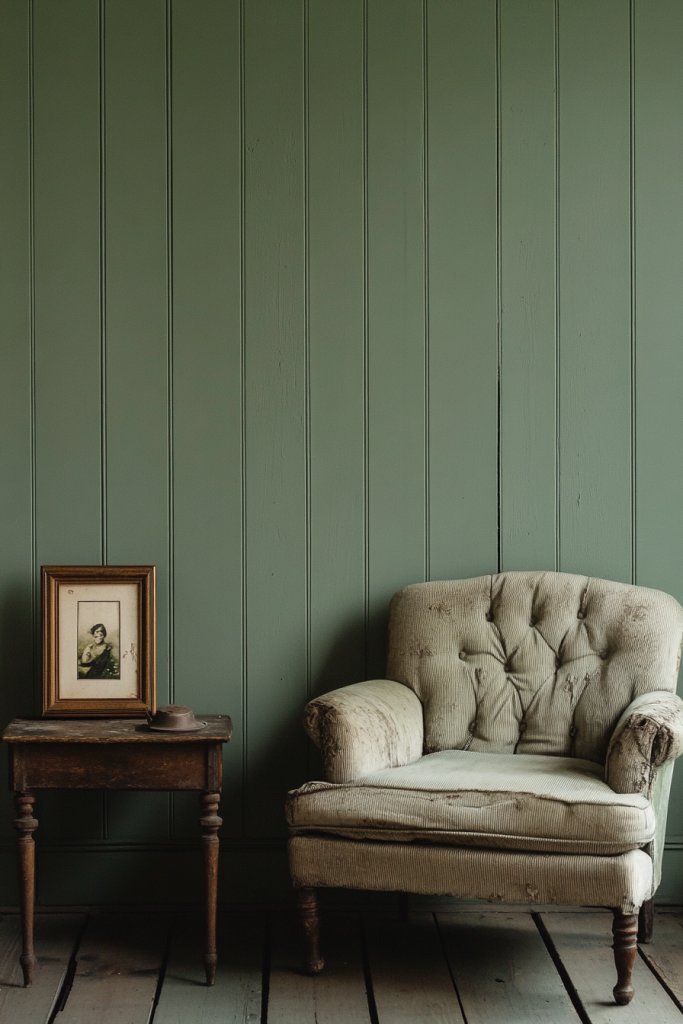 Imagine a cozy living room with a vintage armchair in soft sage, paired with a distressed wooden side table and a plush, textured rug. The walls are painted in a muted sage that complements antique frames, old books, and ceramic accessories. Soft lighting and nostalgic textiles complete the look, creating a space that feels both warm and inviting—like stepping into a bygone era.