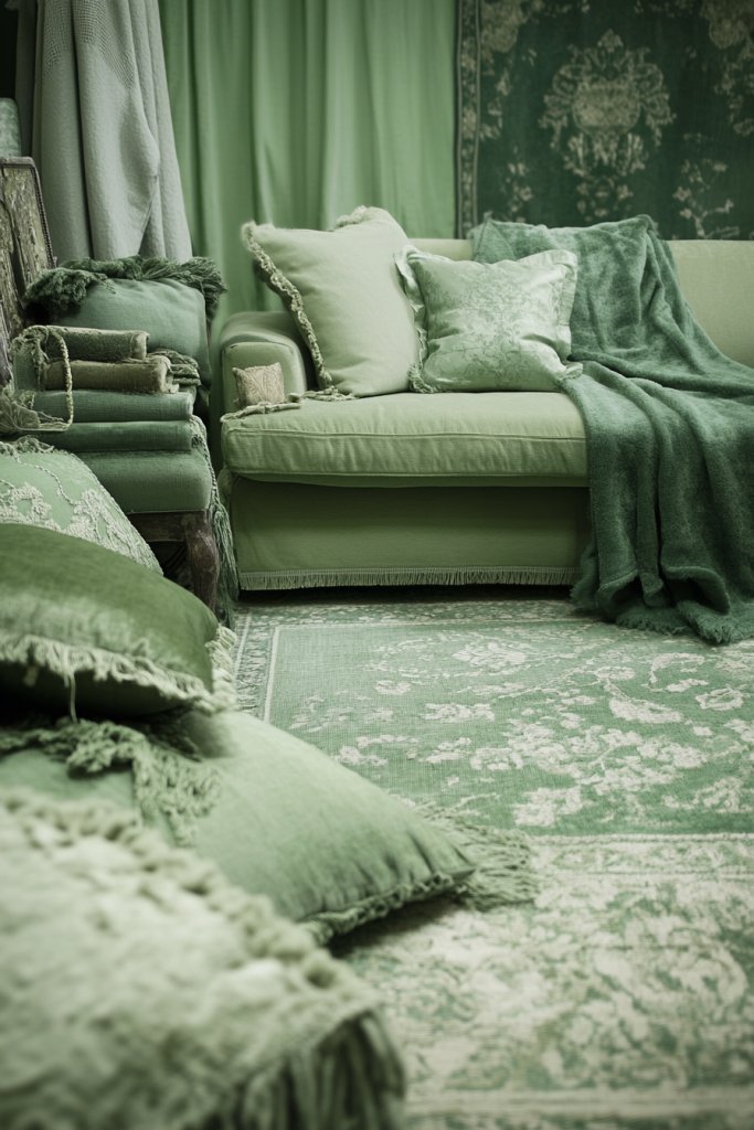 Visualize a room where walls, curtains, and cushions all share varying shades of sage—light, mid-tone, and dark—blending effortlessly. The furniture features clean lines, with some pieces painted in matching or slightly contrasting hues. Textured textiles, like a woven throw or a velvet cushion, add depth without breaking the color harmony. Soft, natural light enhances the layered shades, creating a cohesive, tranquil environment.