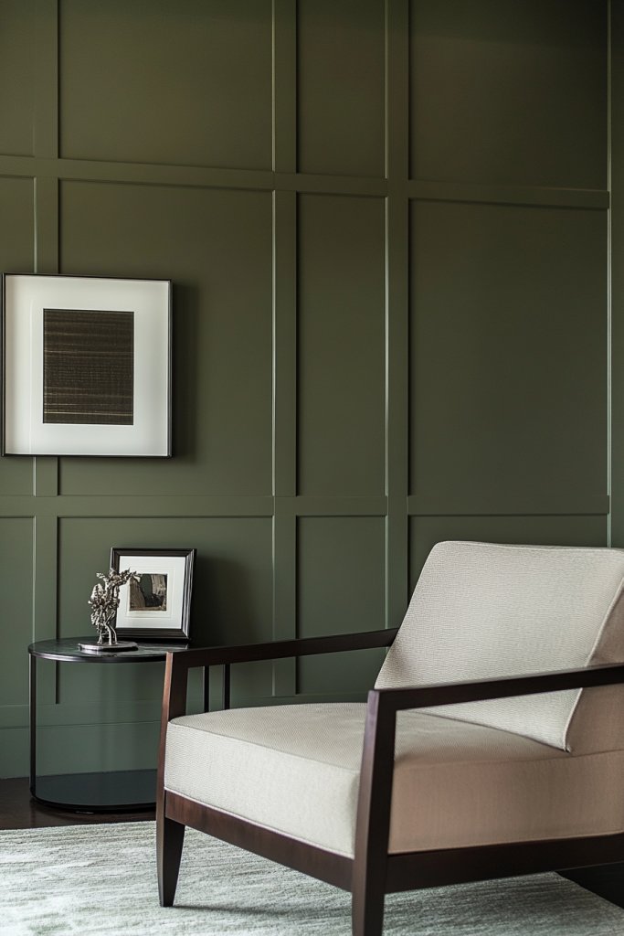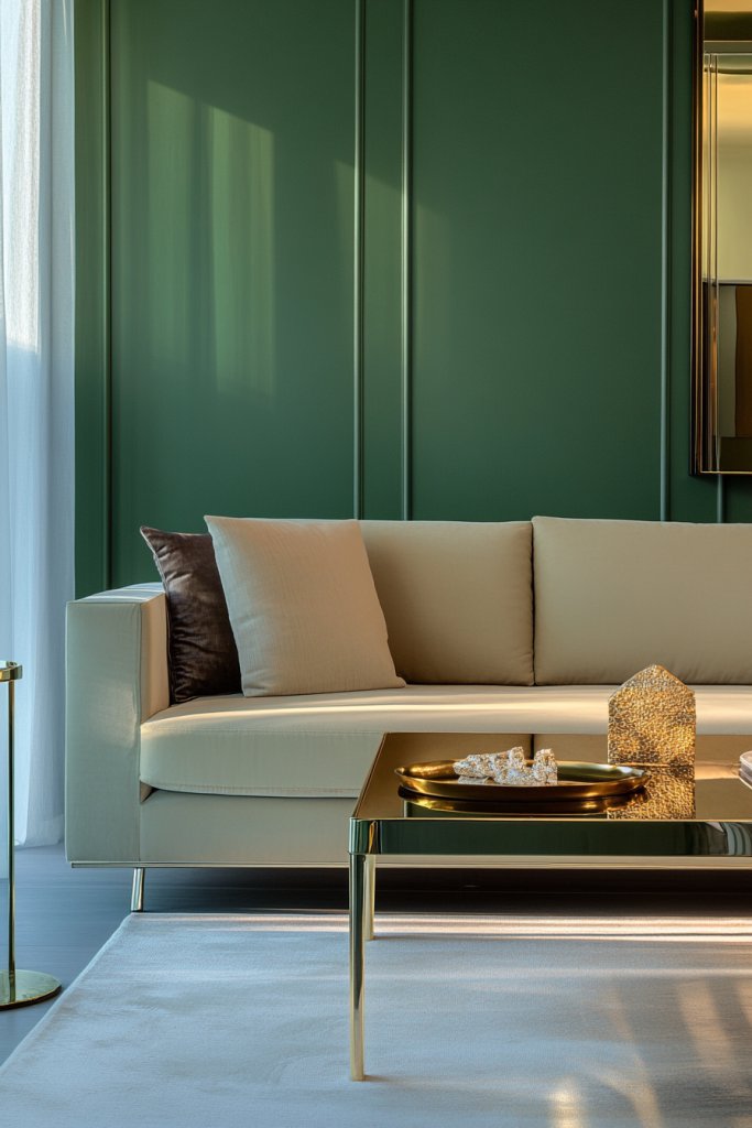 Picture a wall painted in a deep, velvety sage, contrasted by light-colored, sleek furniture. The wall features minimalist decor—perhaps a sculptural mirror or a vintage-inspired shelf—highlighting the color. Ambient lighting casts soft shadows, emphasizing the richness of the paint. The room feels layered and sophisticated, with a focal point that invites curiosity.