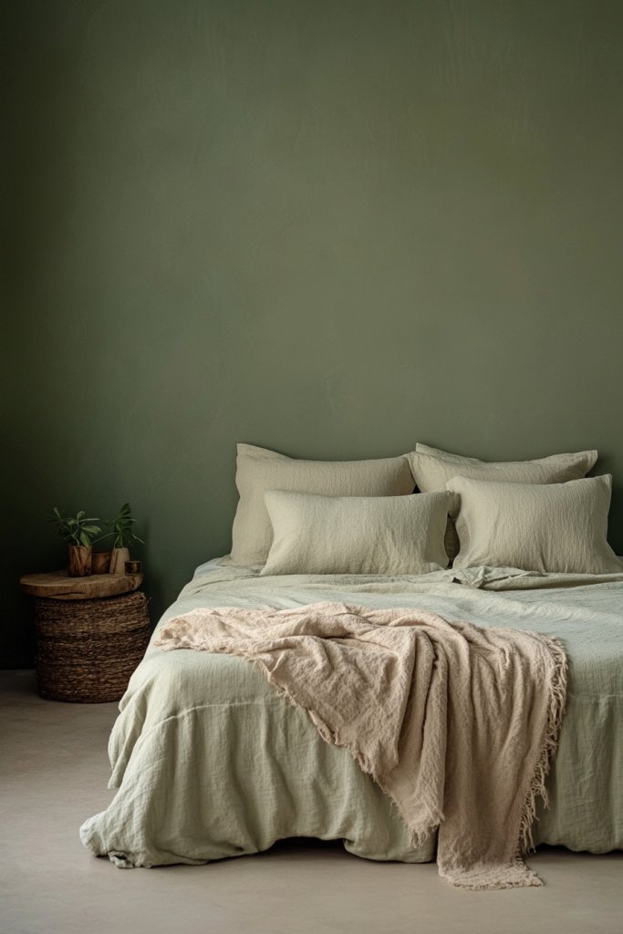 Imagine drifting into bed under a soft duvet in neutral tones, with walls bathed in a gentle sage that reflects the early morning light. Layered bedding in whites, creams, or muted pastels adds to the serenity. A plush, textured headboard and cozy throw pillows complete the inviting retreat. The overall ambiance feels like a peaceful forest glade—calm and restorative.