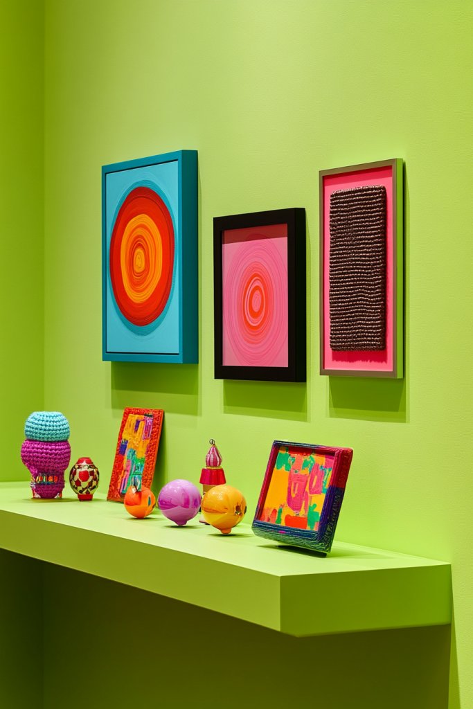 Imagine a living room or hallway with sage-painted walls that serve as a calming background. Bright, bold artwork or textured sculptures stand out beautifully against the muted green. The space feels both lively and cohesive, with the sage hue tying everything together. Light-colored furniture and simple textiles keep the focus on your art, creating an inspiring environment.