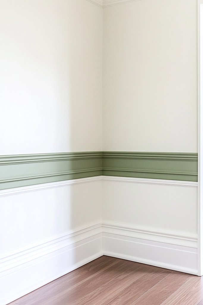 Picture crisp white walls contrasted with sage-green trim outlining door frames, baseboards, and crown molding. The color adds depth and a refined touch while keeping the overall look understated. Soft light reflects off the painted moldings, highlighting their crisp edges. This subtle detail creates a layered, polished aesthetic that feels both classic and modern.