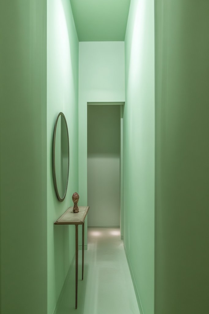 Visualize a slender hallway painted in a soft, pale sage that reflects natural light beautifully. A slender console table with decorative accents or a sleek mirror can add personality without crowding the space. The walls glow softly, and the light color makes the hallway seem wider and more inviting. Small framed photos or decorative wall decals subtly personalize the space.