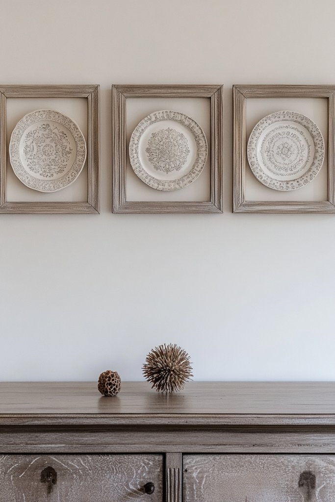 Visualize a series of vintage or modern plates hung in a pattern behind your sideboard. The frames add structure, making them look like curated art pieces. Their intricate patterns and colors add depth and visual interest.