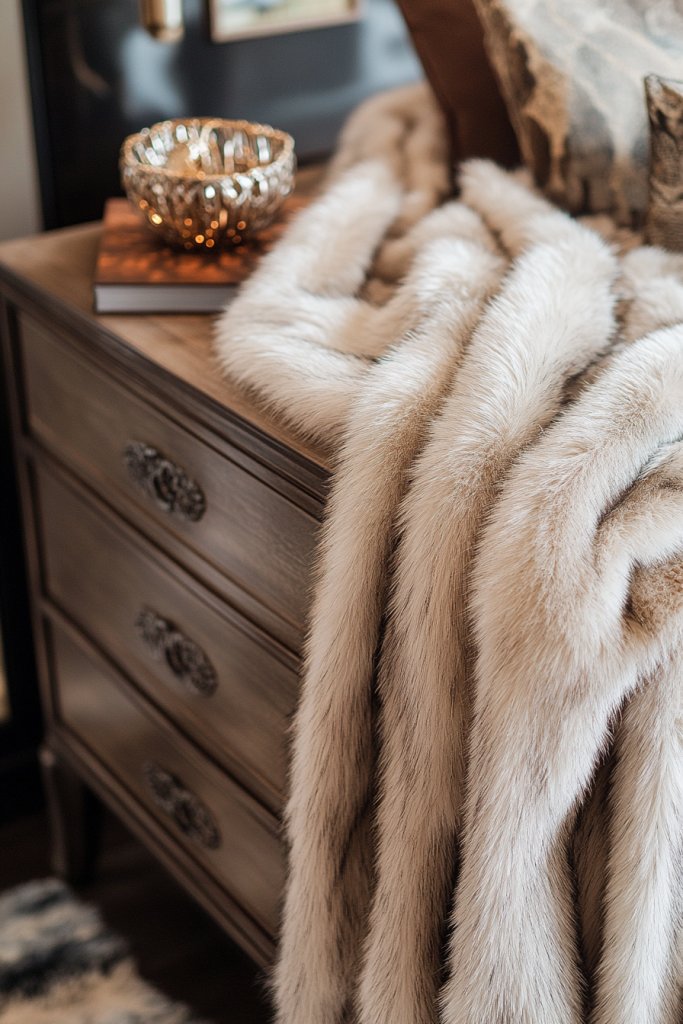A faux fur throw or small rug adds a layer of tactile luxury that makes your space more inviting. It’s a small touch that can make a big difference, perfect for cozy nights or enhancing your decor’s tactile appeal.