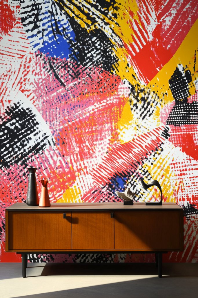 Visualize a bold, patterned wallpaper or a series of framed prints creating a vibrant background. The contrast in patterns and textures draws attention, making the sideboard a focal point. It transforms a plain wall into a statement.