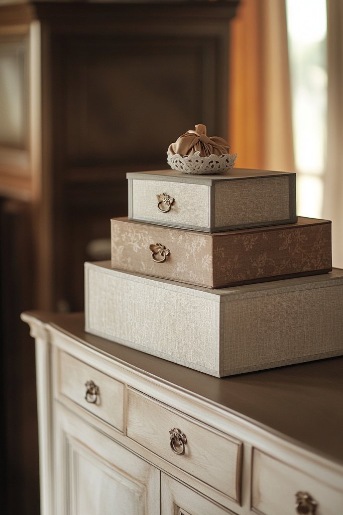 Choose boxes that suit your storage needs and style. Stack them with the largest on the bottom and smallest on top for stability. Use them to store small accessories, linens, or craft supplies. Place decorative objects on top for a finished look.