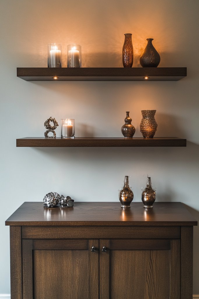 Visualize slim, sleek floating shelves installed above your sideboard, holding small objects like candles, ceramics, or decorative boxes. The clean lines of the shelves make the display appear effortless and modern. They add height and dimension, making the whole area feel more dynamic.