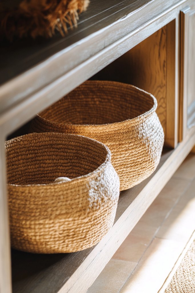 Visualize textured baskets in natural fibers, placed neatly under or beside decorative objects. Their earthy tones and tactile surfaces contrast beautifully with smooth surfaces and clean lines. They soften the overall look while offering practical storage.