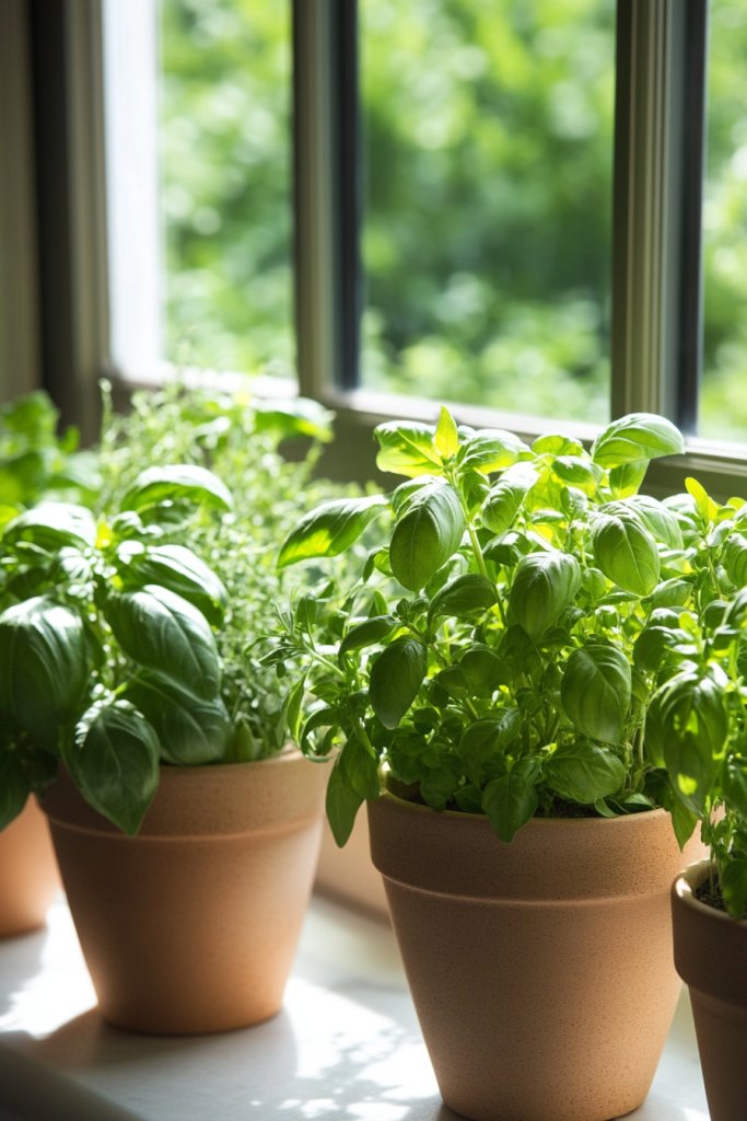 Imagine a row of simple terracotta pots with basil, thyme, and rosemary lined along a sunny windowsill. The vibrant green leaves contrast beautifully with neutral countertops and textured backsplashes. The herbs sway gently with the breeze, filling your space with fresh, herbal scents. It’s a living, breathing element that elevates your kitchen’s natural vibe.